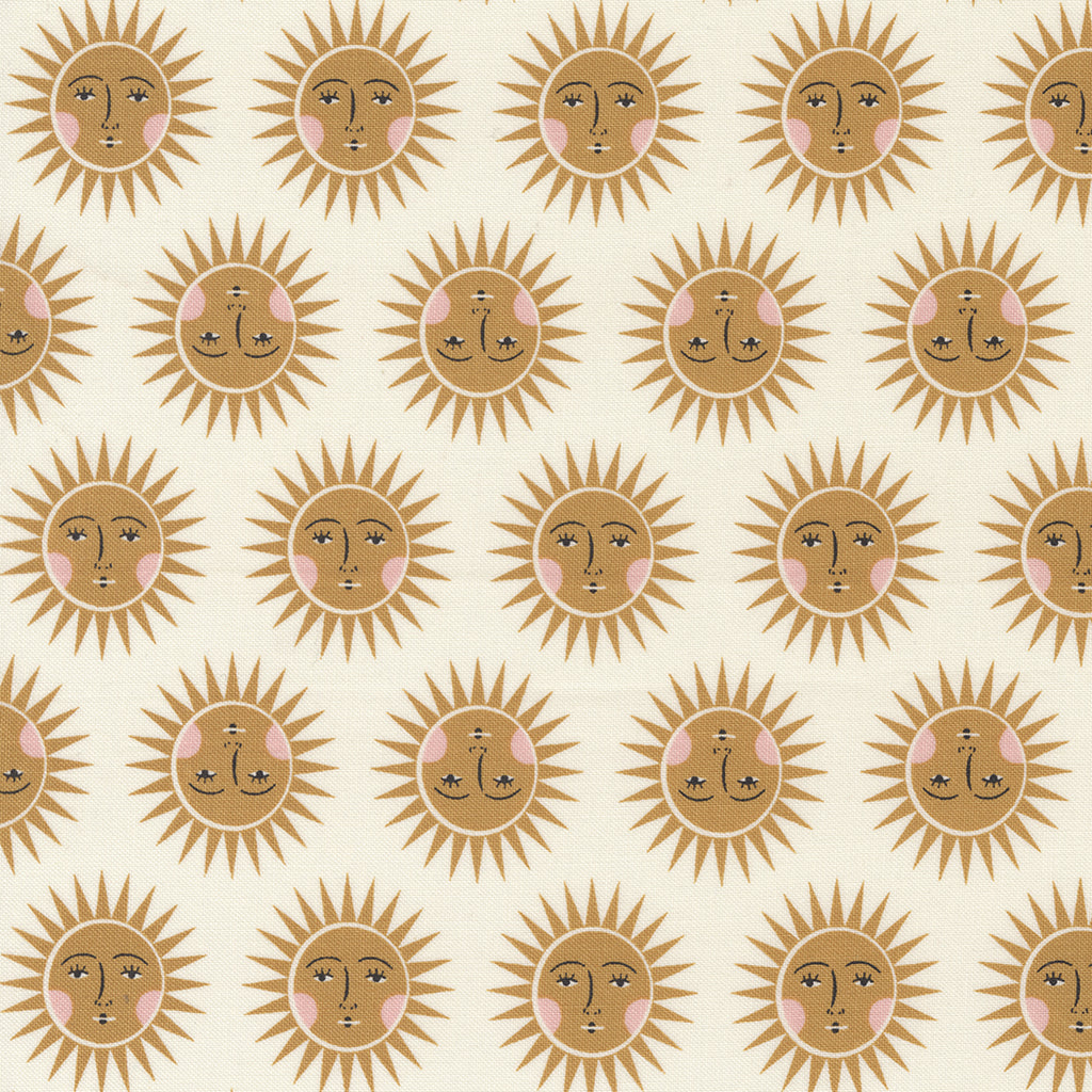 Novelty radiant suns in mustard on a cream background is from Gingiber's fabric range called Birdsong for Moda Fabrics.