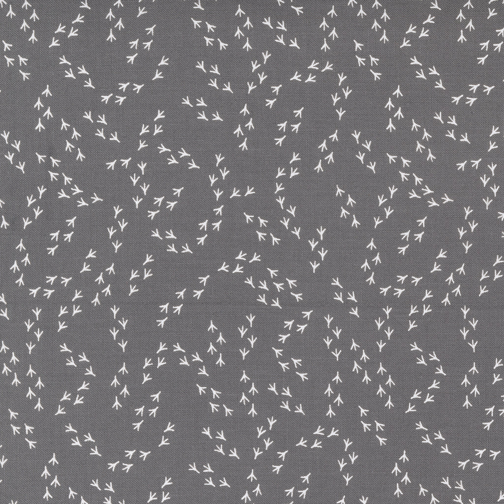 Bird Dance in Pebble (Grey) is from Gingiber's fabric range called Birdsong. It showcases birds feet tracks on a dark grey background.
