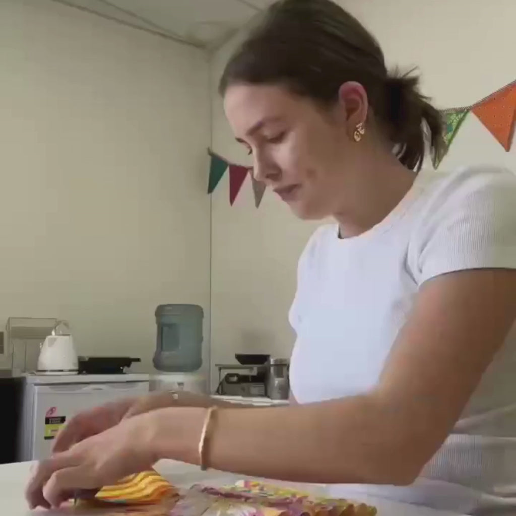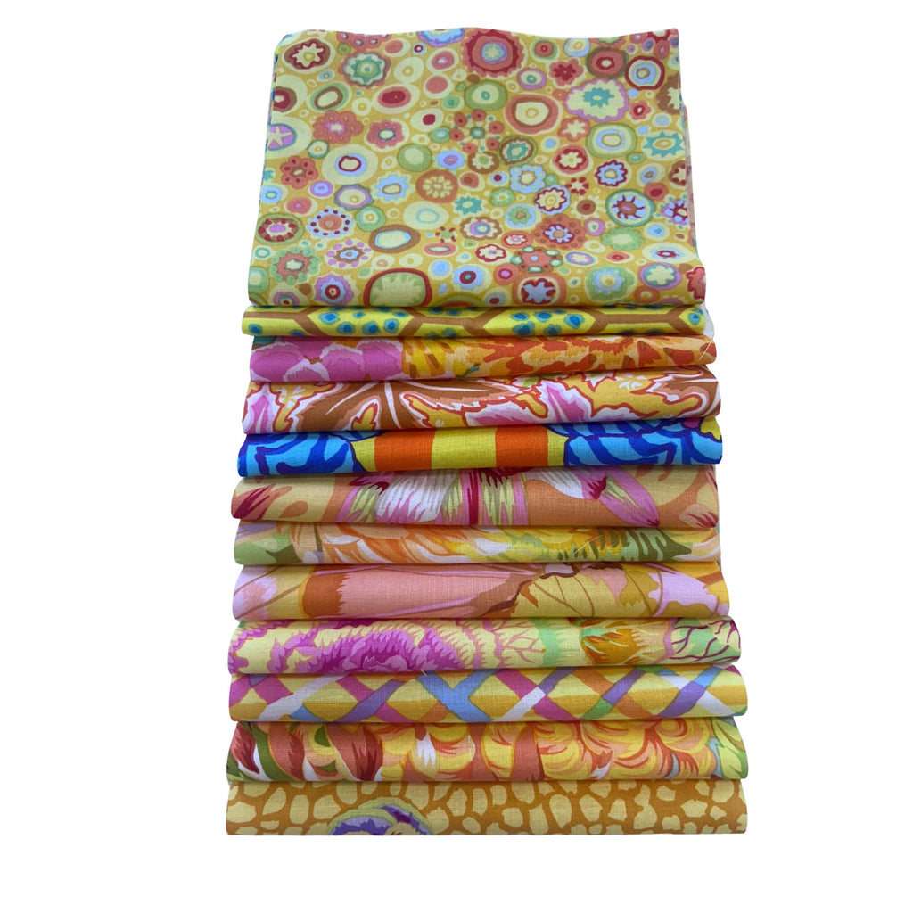 A pack containing a selection of 12 pieces of fabric each 10" x 6" blocks of yellow Kaffe Fassett fabrics.