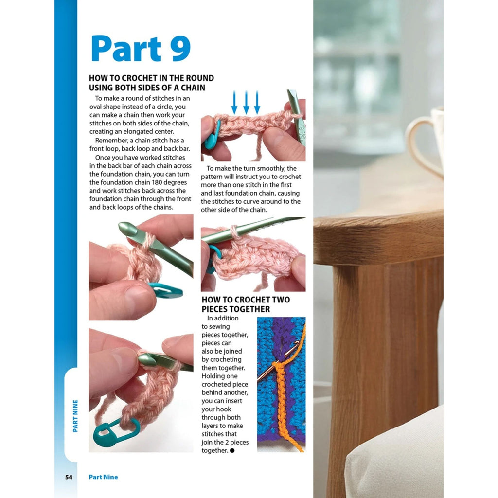The book is divided into parts that gradually introduce new basic stitches and skills. Patterns are written out—none exclusively use abbreviations that would confuse the learner, but abbreviations are introduced alongside spelled-out terms in the later patterns so the beginner can see how crochet patterns are typically written.