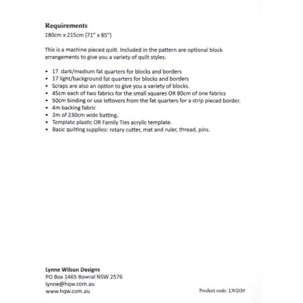 Fat quarter friendly and fun to make this machine pieced quilt is also suitable for using scrap fabrics from your stash. A pieced border using leftovers from the fat quarters finishes this scrappy quilt. Suitable for a beginner to more advanced sewist. Quilt measures 71″ x 85″. Optional Family Ties acrylic template available as an add on product.