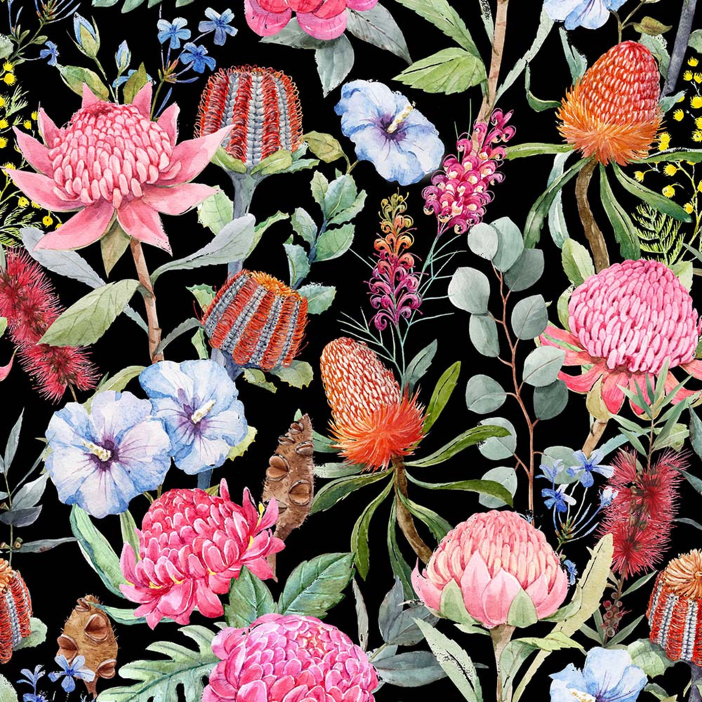 This fabric showcases the many colourful and unique flora that is Australia. Showcasing banksia's and proteas in bloom on a black background.
